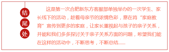 由古及今,母爱一直个永恒的话题,上面的《游子吟》就是唐代诗人孟郊为表达对母亲之爱而作。昨日也正是母亲节,由新东方客服部主办的第一届家庭教育亲子活动之母亲节让宝宝更爱妈妈也在有序地展开......