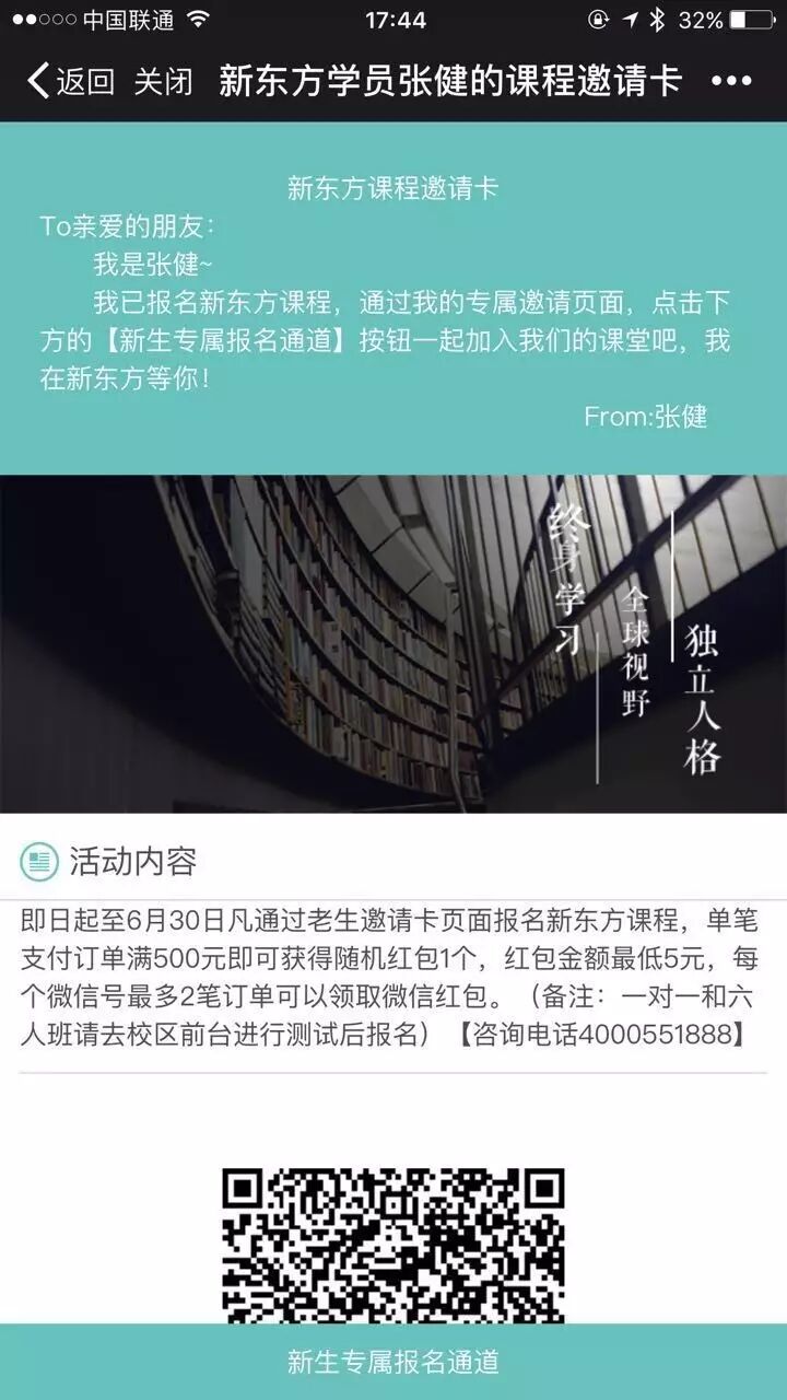 新生通过老生邀请卡通道选择课程报名