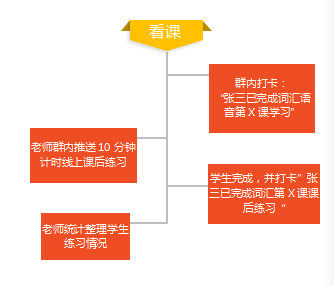所有学员都会进入“云课堂课程打卡群”,学生每完成一课线上学习,需要在群内进行打卡,并完成相应的课后练习,详细流程,看下图哦~