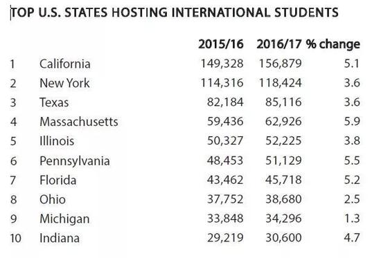 根据美国国际教育部发布的《国际教育交流开放门户报告》,在2016-2017学年,美国最最热门的留学地区是加州和纽约,德州的留学生人数也在增长。