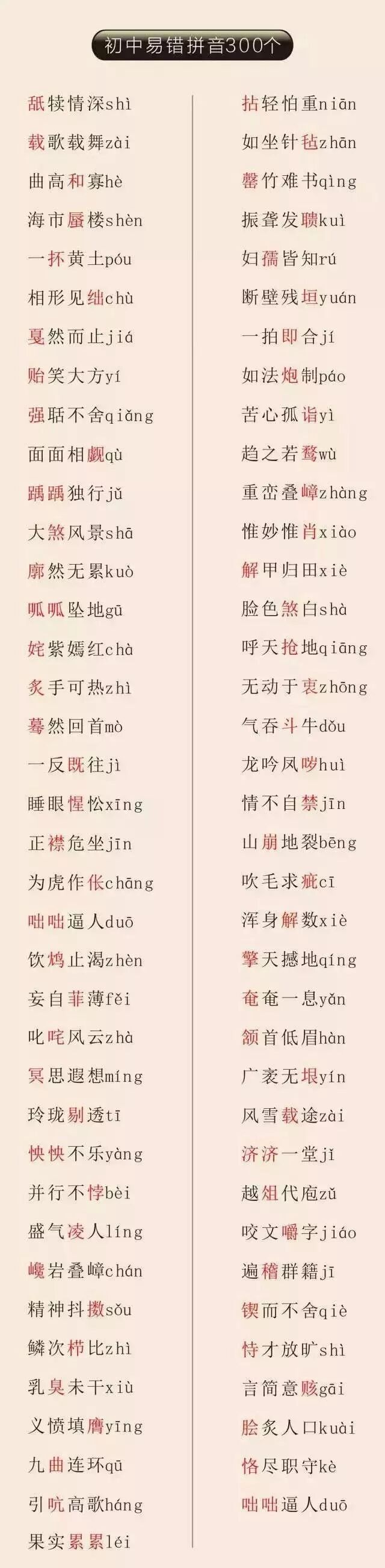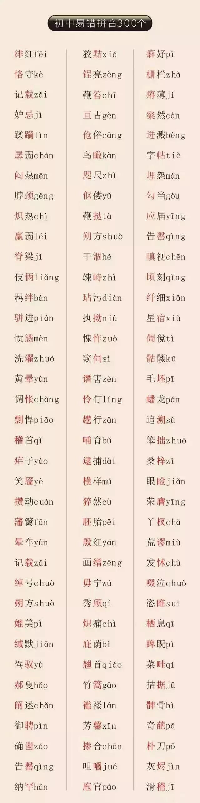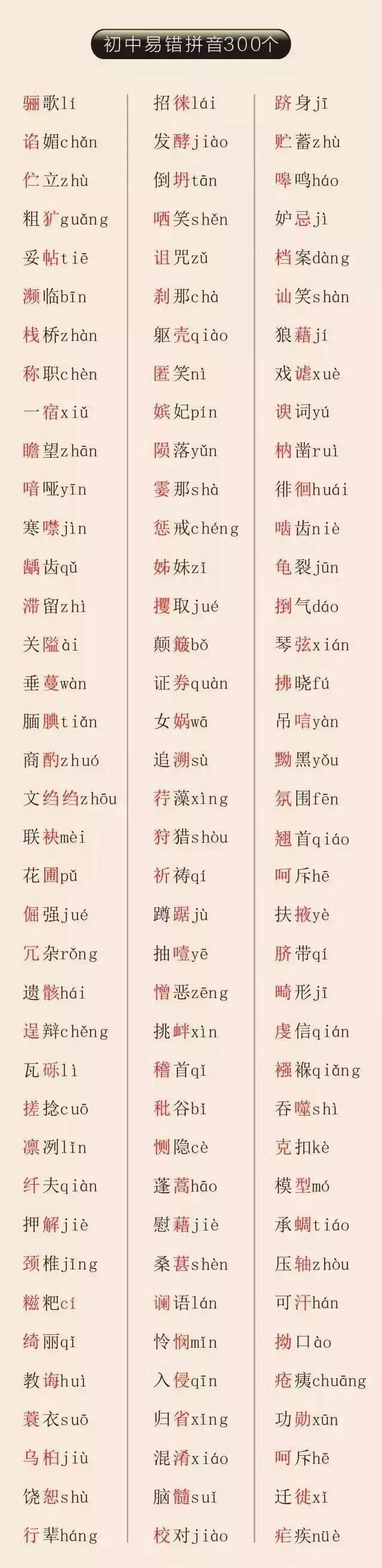所以总结了初中考试最易出错的300个字词读音,大家经常复习,争取在考试中不丢分!
